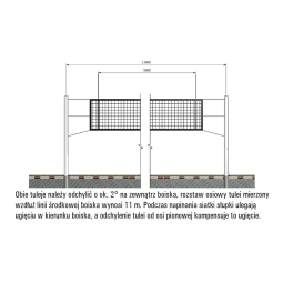 Zestaw stalowych szyn ściennych do siatkówki z profilu 30×30 mm, malowanych proszkowo, z mechanizmem naciągowym. Zakres regulacji wysokości siatki 106–245 cm. Do sal o szerokości do 12 m. Możliwość zastosowania także do tenisa i badmintona.