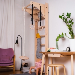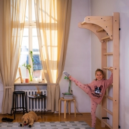 Gymnastikleiter 112 aus Buchenholz, 0,67 m breit und 2,2 m hoch. Inklusive 8 Sprossen, abnehmbarer Klimmzugstange, Kinderzubehör und Montageteilen. Maximale Belastung: 120 kg, Gewicht: 23 kg.