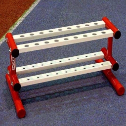 Przejezdny stojak na oszczepy o pojemności 18 sztuk, wykonany z rur i kształtowników stalowych, lakierowany proszkowo, wyposażony w kółka ułatwiające transport.