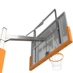 Zestaw do koszykówki z tablicą akrylową 105x180 cm, obręczą PREMIUM, siatką i osłoną tablicy. Słup 100x100 mm z wysięgnikiem 120/140/160 cm, montowany w tulejach. W komplecie korbka do regulacji wysokości. Do użytku zewnętrznego.