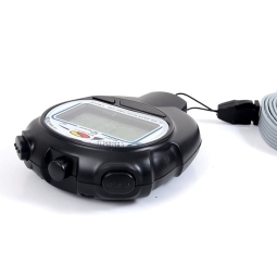 Professionelle elektronische Stoppuhr mit Funktionen zur Messung von bis zu 100 Rundenzeiten und Intervallen. Ausgestattet mit Timer, Temperaturanzeige (10-320 Signale/Minute) und Uhr mit Alarm, wählbarem 12/24-Stunden-Format und automatischem Kalender.