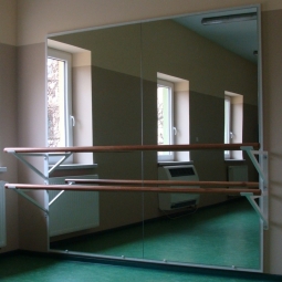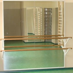 Glatter Wandspiegel mit doppelten Handläufen, maschinell geschliffen, 4 mm dick. Mit einem Gummiband an der Spanplatte befestigt. Erhältlich mit Wandhalterung oder freistehend. Ideal für Turnhallen, Ballett- und Tanzsäle.