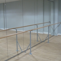 Glatter Wandspiegel mit einem Handlauf, maschinell geschliffen, 4 mm dick. Mit einem Gummiband an der Spanplatte befestigt. Erhältlich mit wandmontierter oder freistehender Halterung. Ideal für Turnhallen, Ballett- und Tanzsäle.