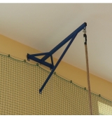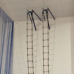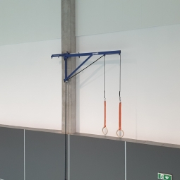 Laufschiene zum Aufhängen von Seilen, Barren und Gymnastikrädern, mit einem System, das ein schnelles Auf- und Zusammenklappen ermöglicht. Selbstsperrendes System für die Sicherheit. Individuelle Befestigung an der Dachkonstruktion.